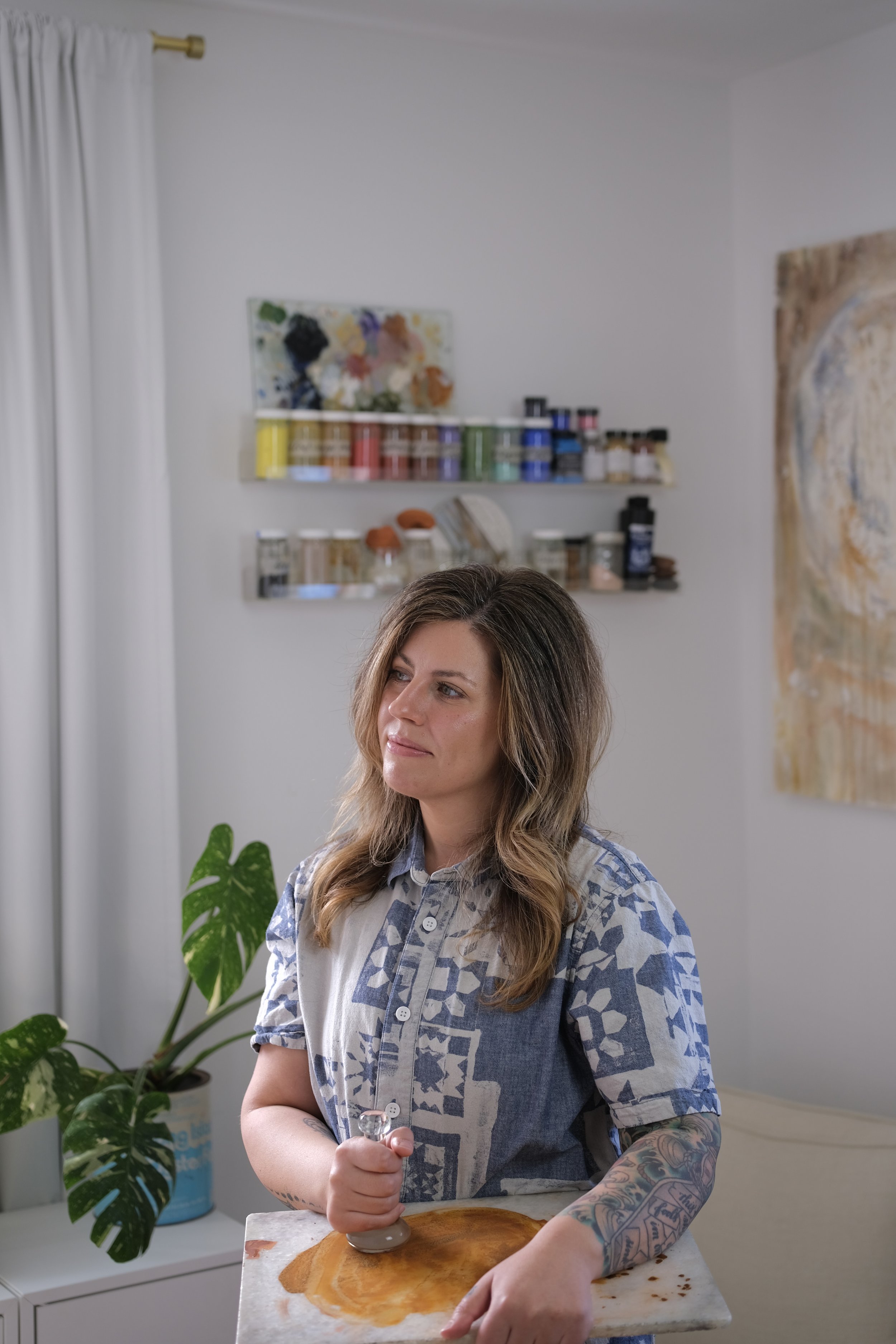 Christie Jones (b. 1987) is a Patchogue–Medford based eco artist whose work bridges artmaking, aquaculture, and environmental advocacy through a circular material practice. Inspired by Long Island’s coastal ecosystems, she creates paintings, ceramics, and sculptural works using handmade watercolor paints derived from earth and mineral pigments alongside recycled oyster shells and reclaimed coastal materials to explore climate change, resilience, and shoreline regeneration.