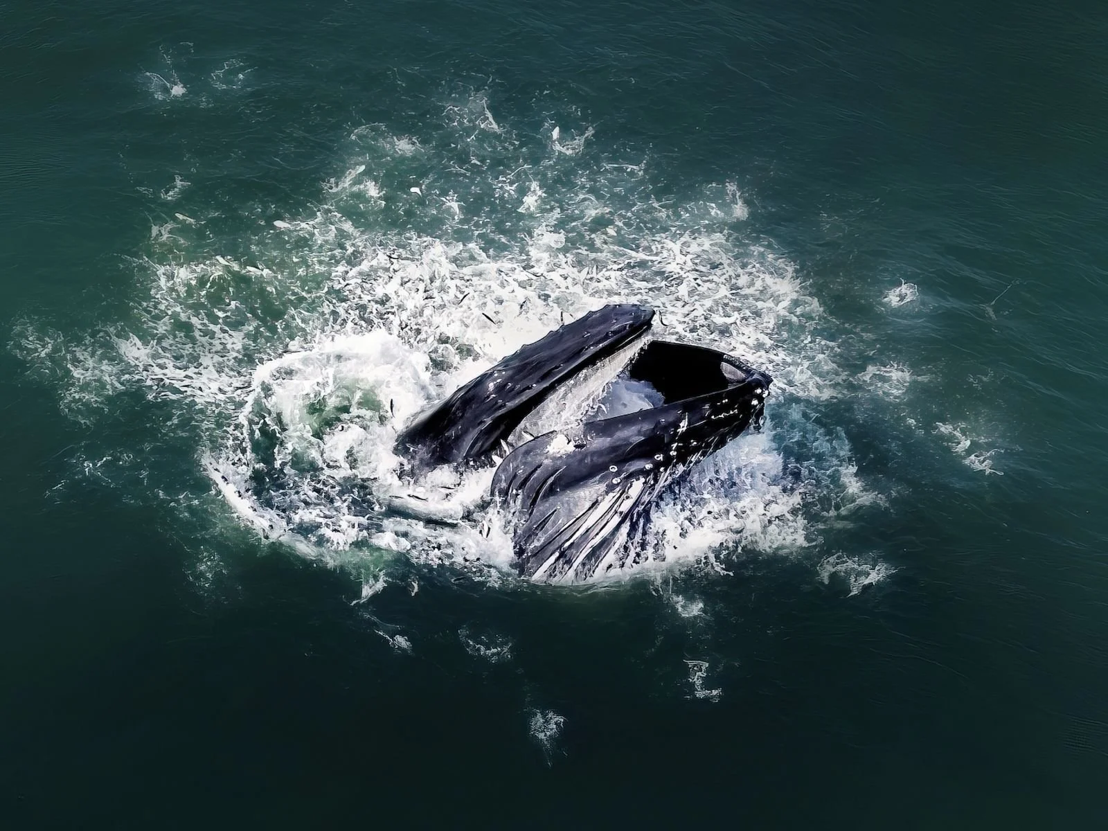 Photo Credit: Awakened Surging upward from below, a humpback whale lunges to feed on menhaden. © Joanna Steidle/Hamptons Drone Art
